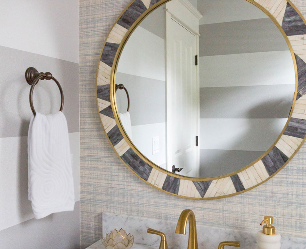 We replaced the expansive wall of vanity mirrors with burnished brass arched mirrors framed against a chalky gray textured wallpaper with subtle gold undertones. This feature added layers of warmth and movement while maintaining the open, light-filled quality the clients loved. Around the freestanding tub, we framed the space to showcase light, creating a balanced atmosphere that highlights the new pendant light’s soft wave pattern.